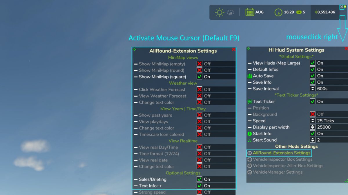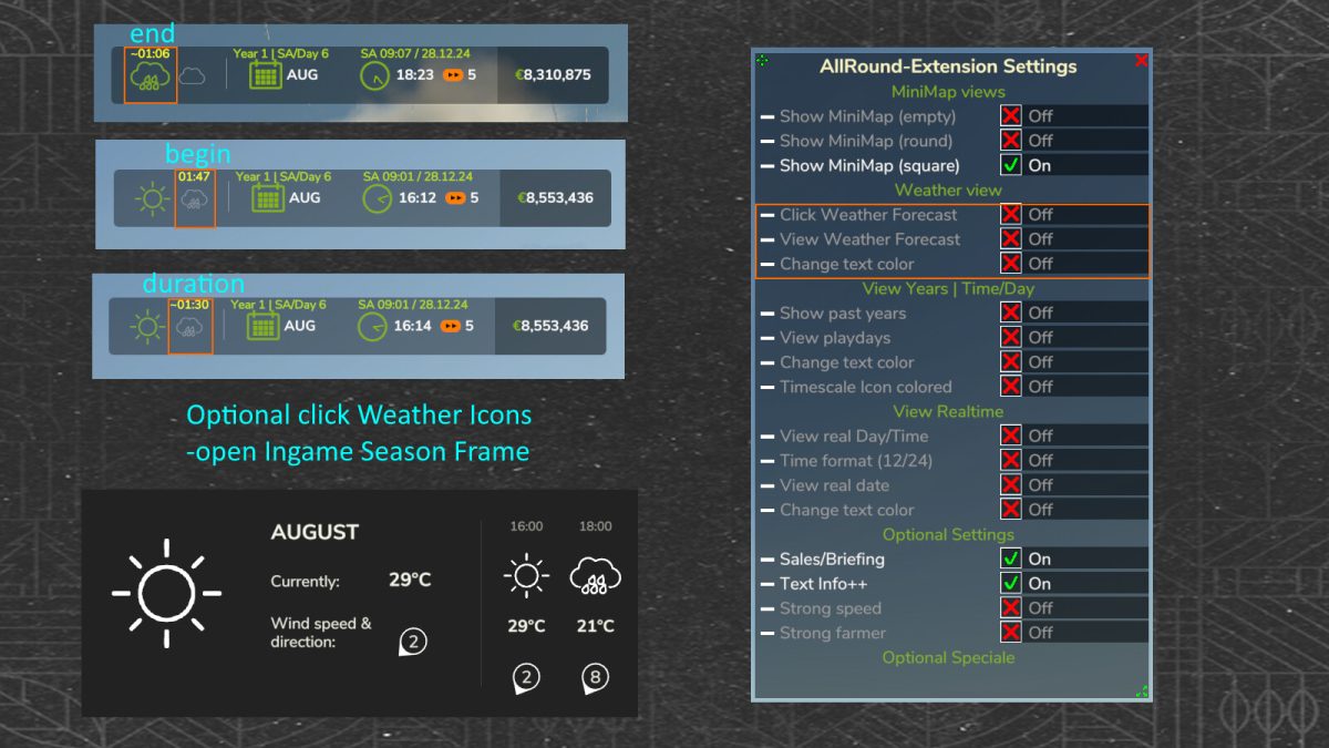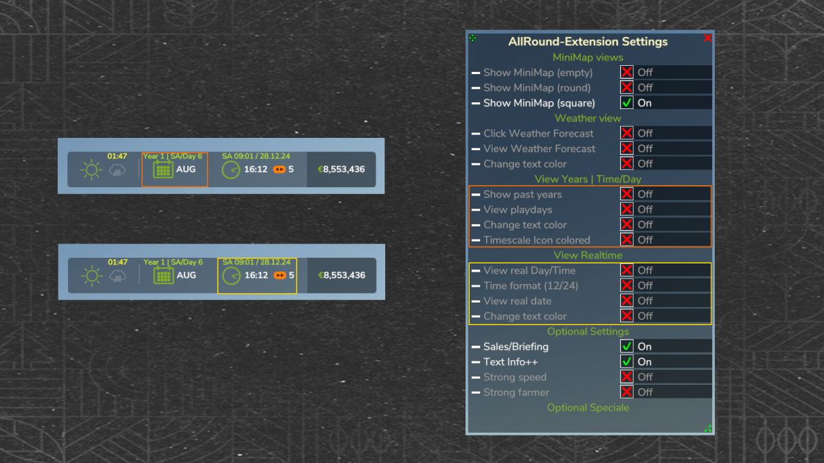The mod includes the implementation of real-world date and time, adding a layer of authenticity to the gameplay. Players will have the opportunity to experience the passage of in-game years and days, allowing for more strategic planning in their farming activities. Additionally, the minimap views can be adjusted, giving players the ability to switch between different perspectives for better navigation.