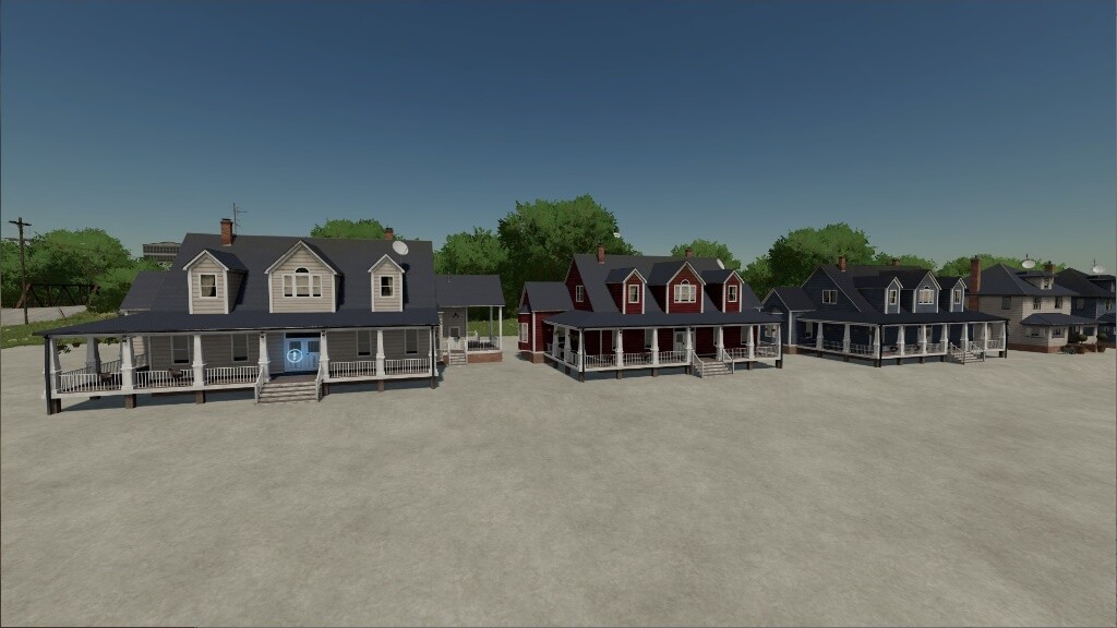 Farm buildings pack with buildings of Elmcreek. Contains 3 farm houses in different colors, one multi fruit silo, three silo extensions, a buying silo, a workshop garage, a well, multiple sheds and decorative houses.