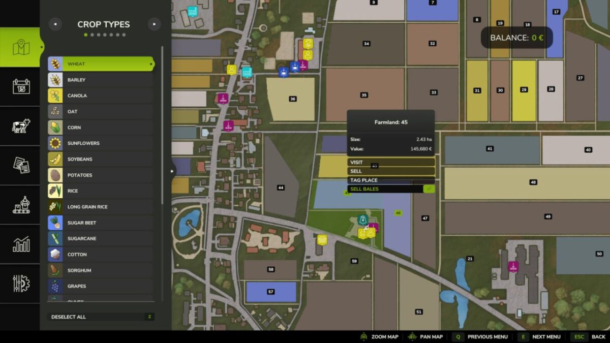 Select an owned farmland with bales on the map to see the “Sell Bales” button.