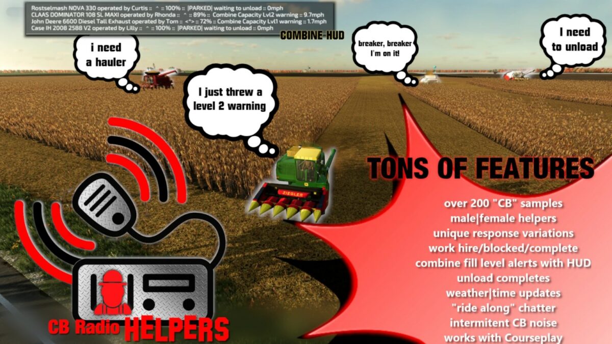A discrete GUI panel is also added for combines showing each machine in service, their fill load percentage, speed, helper, field, direction and alert status (like combine full).