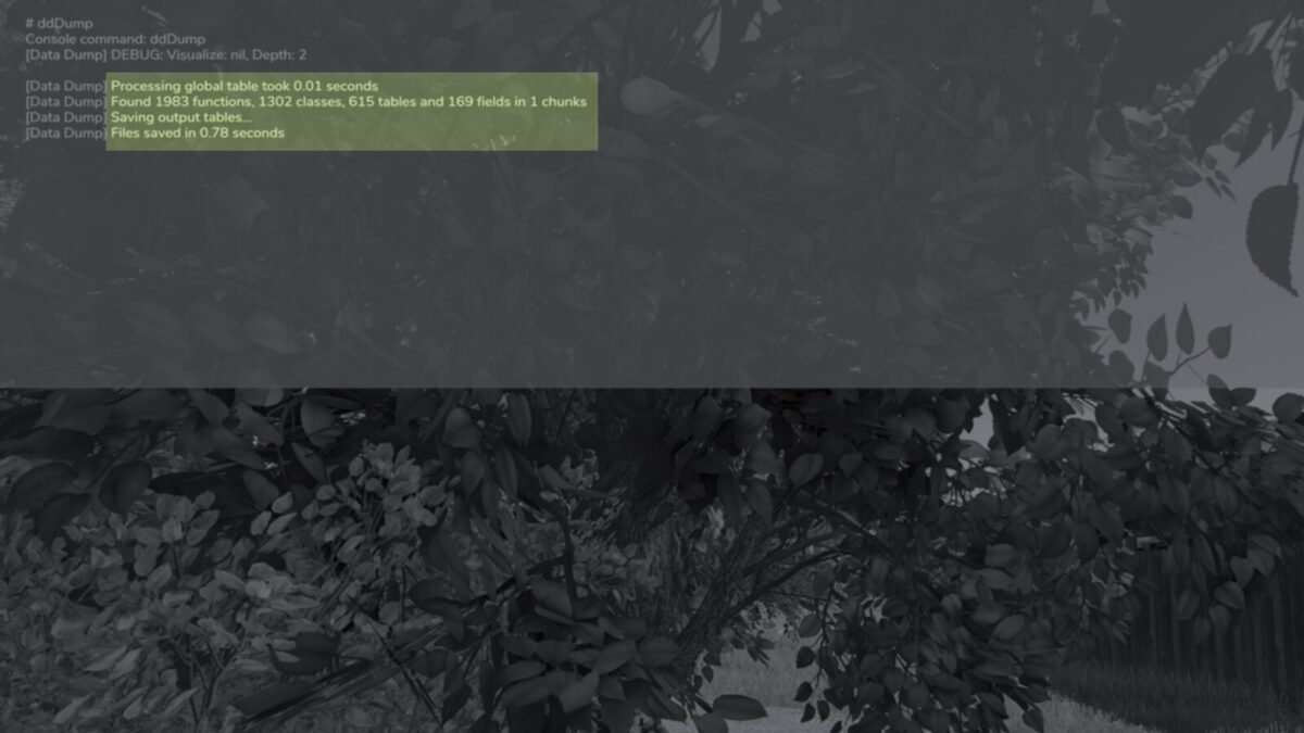 4. (optional) Execute ‘ddSaveGlobalTables {maxDepth} {forceDeep}’ – this will automatically export all global “g_*” tables as well as specifically the “g_currentMission” and “g_localPlayer” in deeper table structures (the ddDump command exports a shallow strucutre for performance reasons)