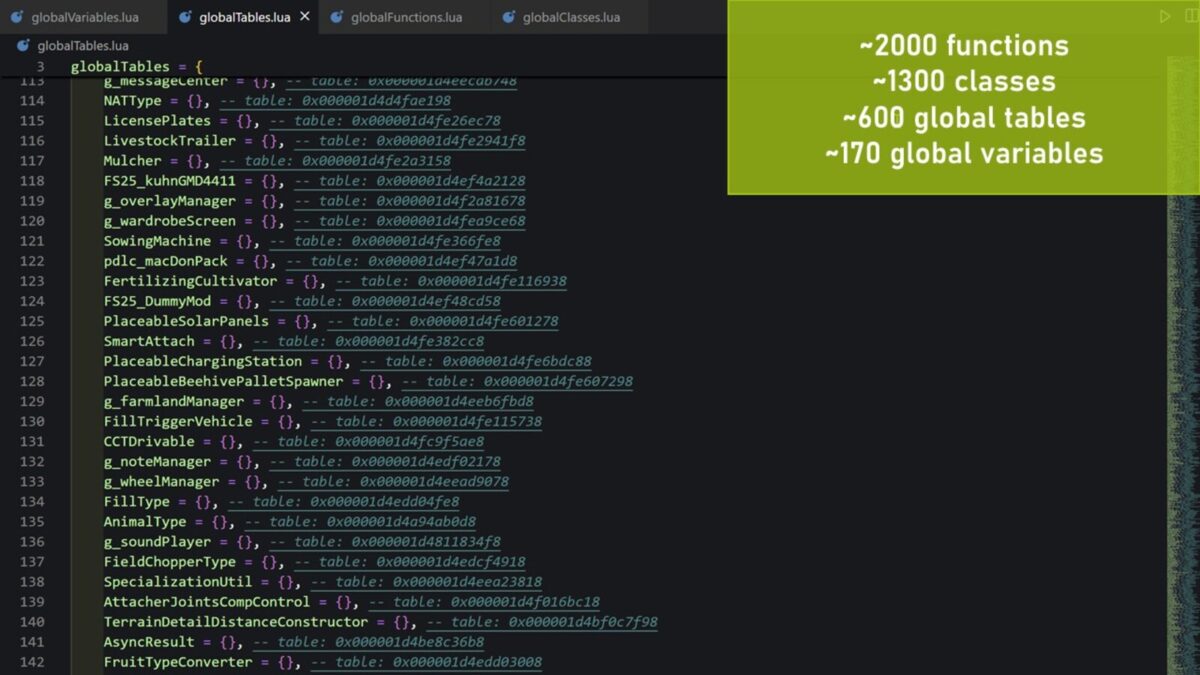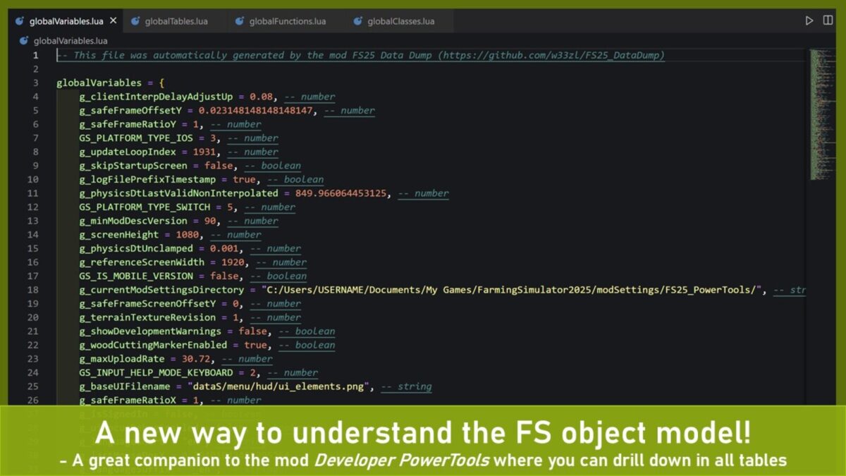 The main purpose of this mod is to save the global tables, functions, classes and variables from Farming Simulator to well-formed Lua files. Use these files to better understand the Farming Simulator object model through reverse engineering (especially useful until the official documentation is released).