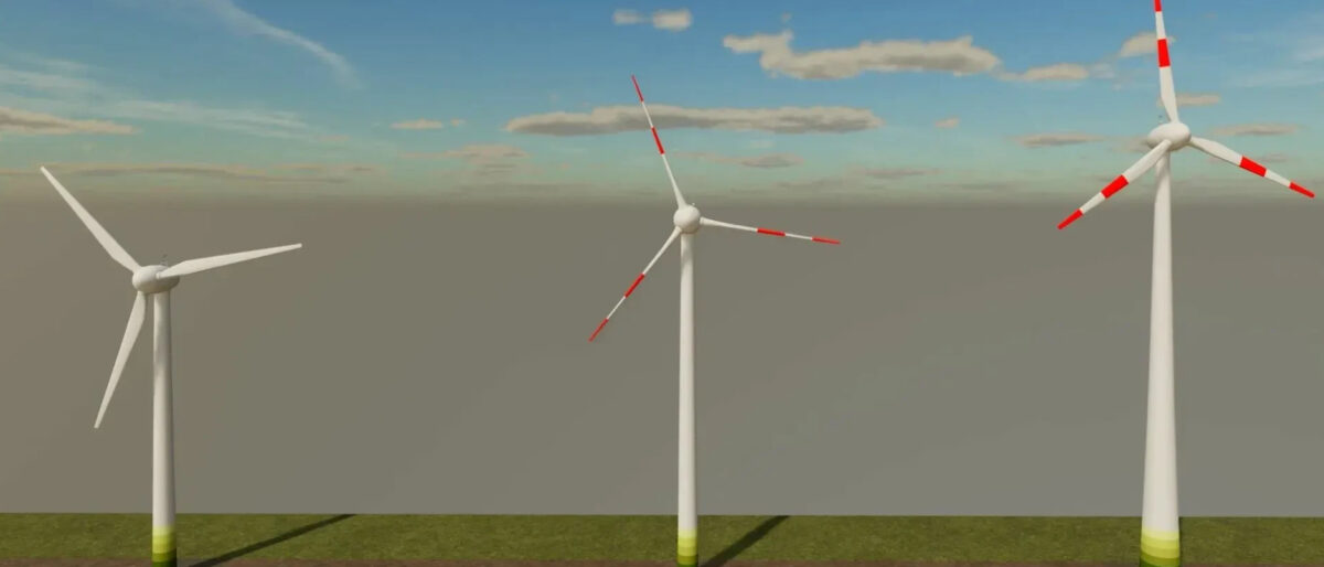 This mod consists of 5 wind turbines from Enercon with different hub heights. This includes, among other things: These are the first turbines from Enercon with the typical egg shape and rotor blades without trailing edge segments.