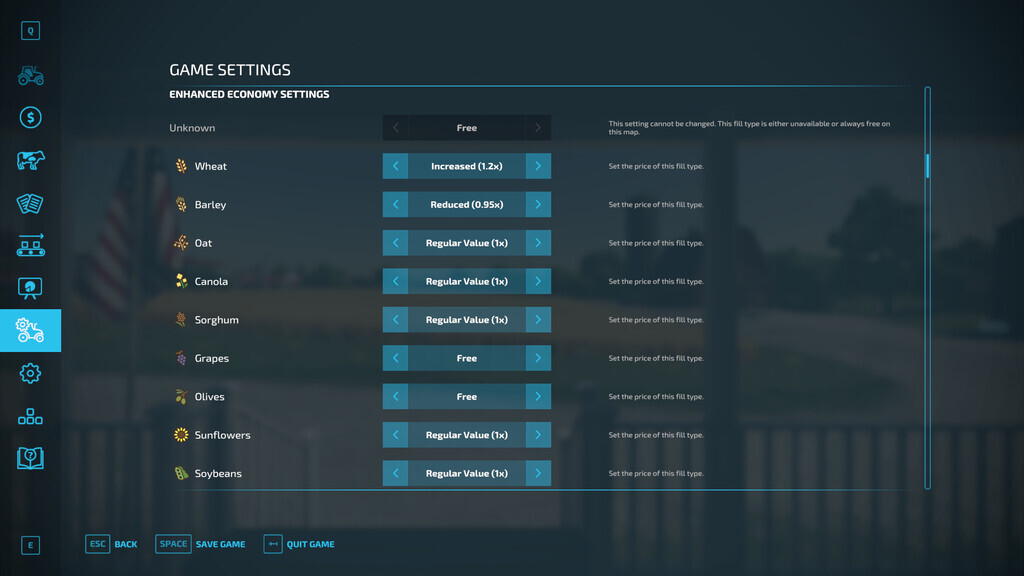 Introducing “Enhanced Economy Settings”: the mod that brings greater control and flexibility to your farming experience! This modification introduces new settings, allowing admins to adjust the global economy. With Enhanced Economy Settings, navigate through a myriad of individual fill type settings, ensuring a finely-tuned financial system that is tailored to your desired gameplay. Whether you seek to boost your profit or regulate prices, this mod is your ultimate tool for shaping a dynamic and immersive economic experience. Take command of your farming simulator economy like never before with the extraordinary “Enhanced Economy Settings” mod!